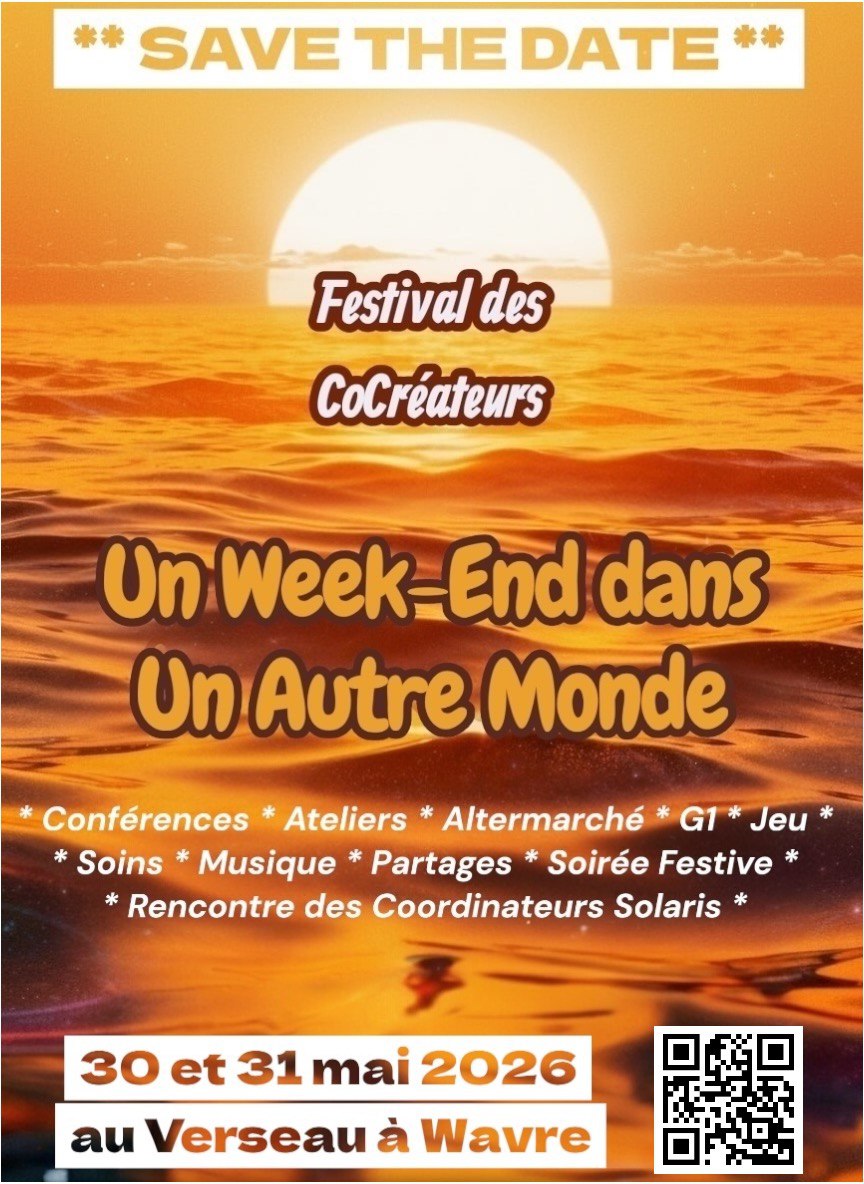 Un weekend dans un autre monde qui se déroulera à l’Ecole du Verseau à Wavre les 30 et 31 mai 2026.