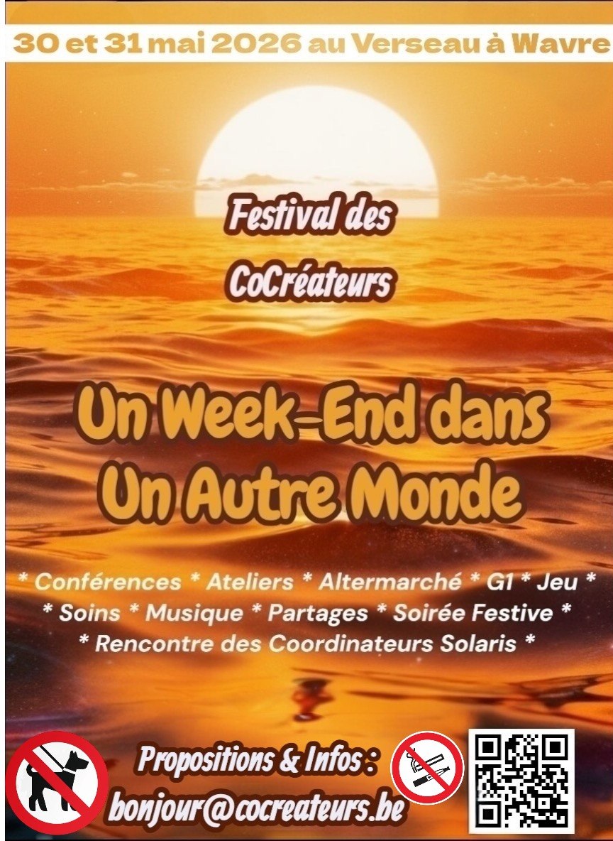 La vocation de ce site est de communiquer sur le Festival des Cocréateurs 2026 : un weekend dans un autre monde qui se tiendra à l’Ecole du Verseau à Wavre les 30-31 mai 2026.